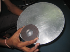 Mount the disc on the spindle of the tape motor. Connect the motor to the power source through an adaptor. Switch on the power so that the tape motor along with the connected aluminum disc starts rotating. Soon it will pick up a good speed. Now bring a magnet very close to the rotating disc. A pole should face the disc surface. The disc gradually slows down to almost a halt. Take the magnet a bit away. The disc again picks up speed.